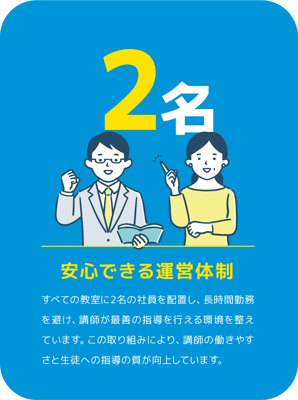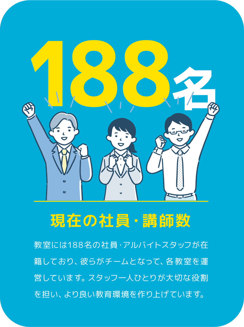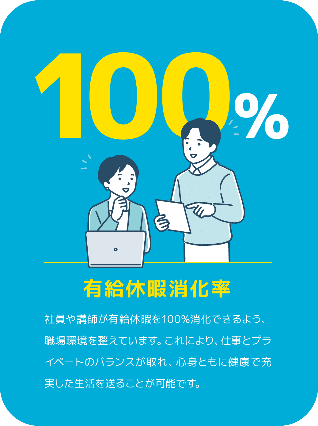 私たちは社員や講師が安心して働ける環境を提供し、ワークライフバランスを大切にしています。社員一人ひとりの挑戦と成長をサポートし、チームとしての連携を強化することで、より良い教育サービスを提供することを目指します。
