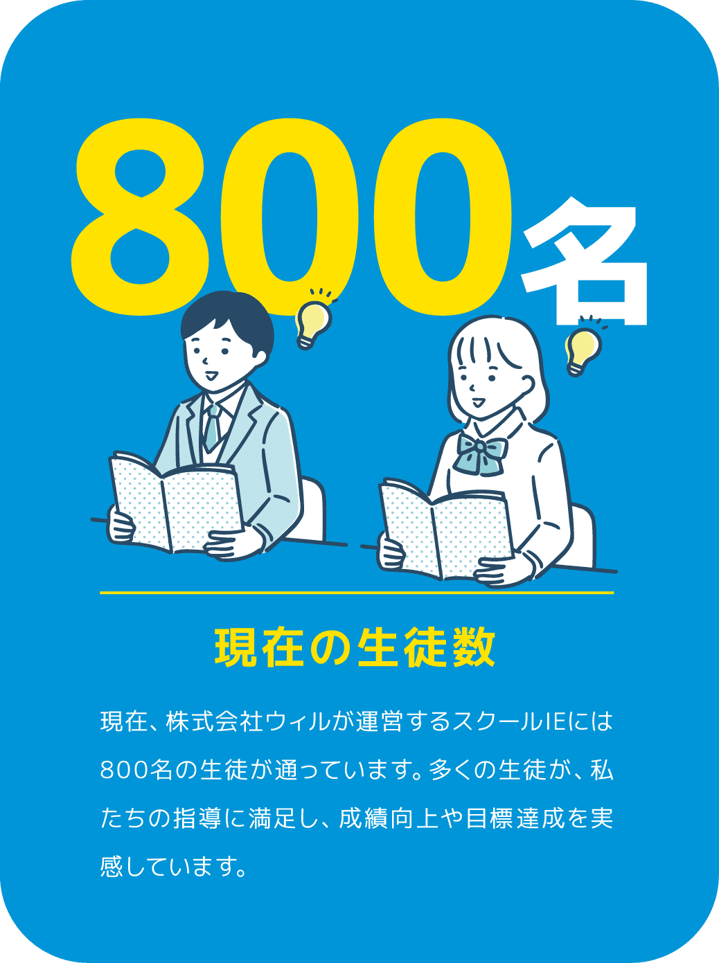私たち株式会社ウィルは、子どもたち一人ひとりが持つ無限の可能性を信じ、その可能性を最大限に引き出すことを目指しています。私たちは教育を通じて、生徒たちが自らの意志で未来を切り拓く力を身につけることを支援します。